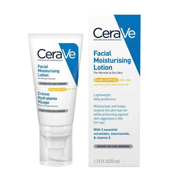 CeraVe Facial Moisturising Lotion AM SPF 50 is a daily moisturizer that deeply hydrates and protects the skin against harmful UV rays. Infused with ceramides, hyaluronic acid, and niacinamide, this lightweight lotion restores the skin's natural barrier and locks in moisture, providing long-lasting hydration throughout the day.